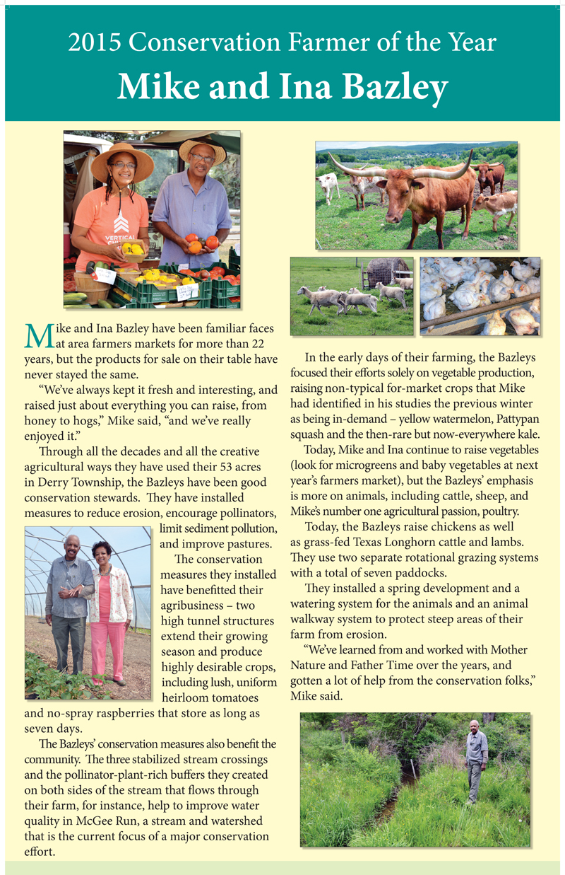 Mike and Ina Bazley (right) received the award for Conservation Farmer of the Year. Making the presentation on behalf of the Conservation District were, left to right, board members Westmoreland County Commissioner Ted Kopas and Kim Edward Miller.